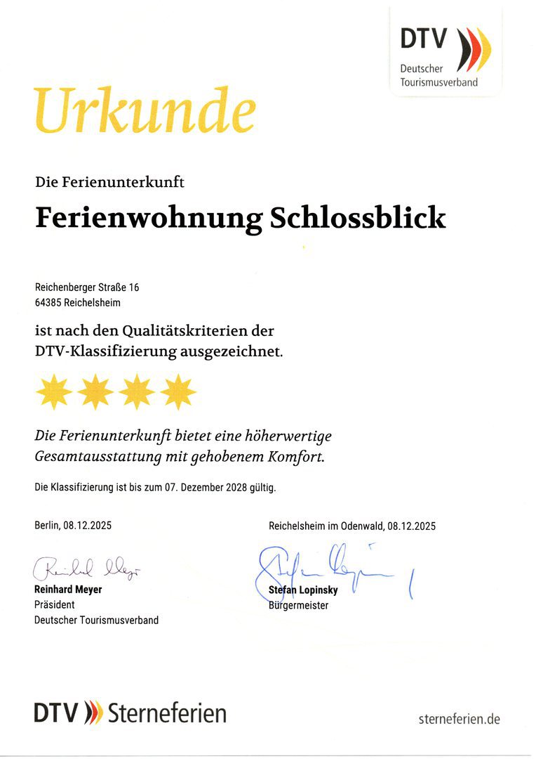 Unsere Ferienwohnung Schlossblick steht seit Jahren für geprüfte Qualität und besonderen Komfort. Bereits 2013 wurde sie erstmals vom (Deutscher Tourismusverband) mit vier Sternen klassifiziert und zertifiziert. Diese Auszeichnung konnte die Ferienwohnung nun 2025 bereits zum fünften Mal in Folge erfolgreich bestätigen – ein verlässliches Zeichen für gleichbleibend hohen Standard und Wohlfühlambiente für unsere Gäste.